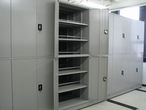 該樣式密集架適用于要求承重較大庫房,因為密集架架體中間增加了隔板,被稱為“半封閉”或“臺灣式”手動密集架,其承重性能優(yōu)于前兩種密集架。